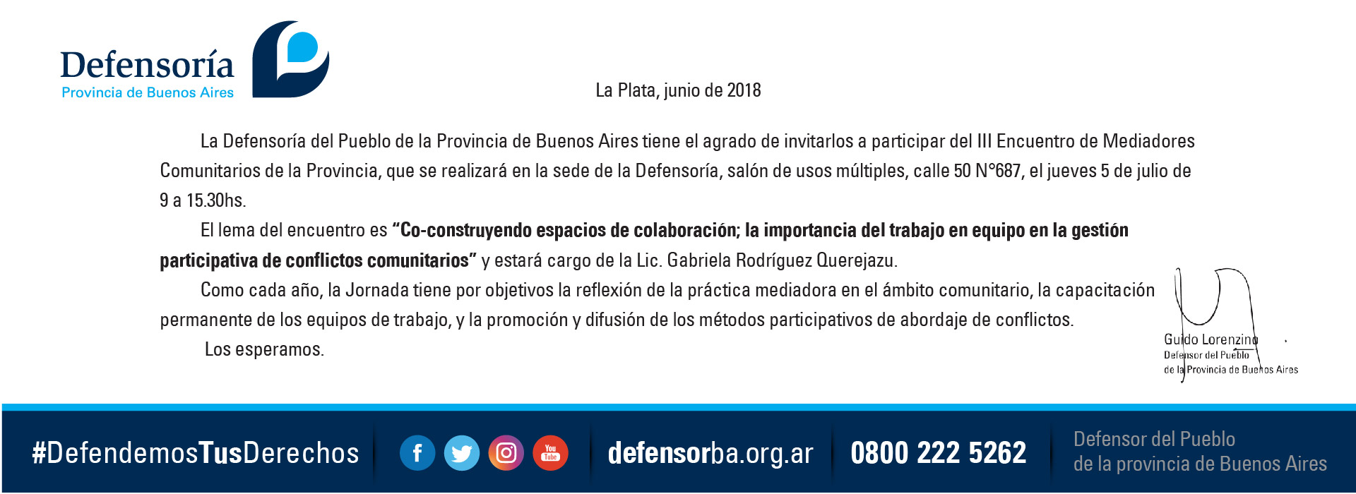La Defensoría del Pueblo bonaerense realizará el III Encuentro de Mediadores Comunitarios de la provincia de Buenos Aires: “Co-construyendo espacios de colaboración. La importancia del trabajo en equipo en la gestión participativa de conflictos comunitarios”.